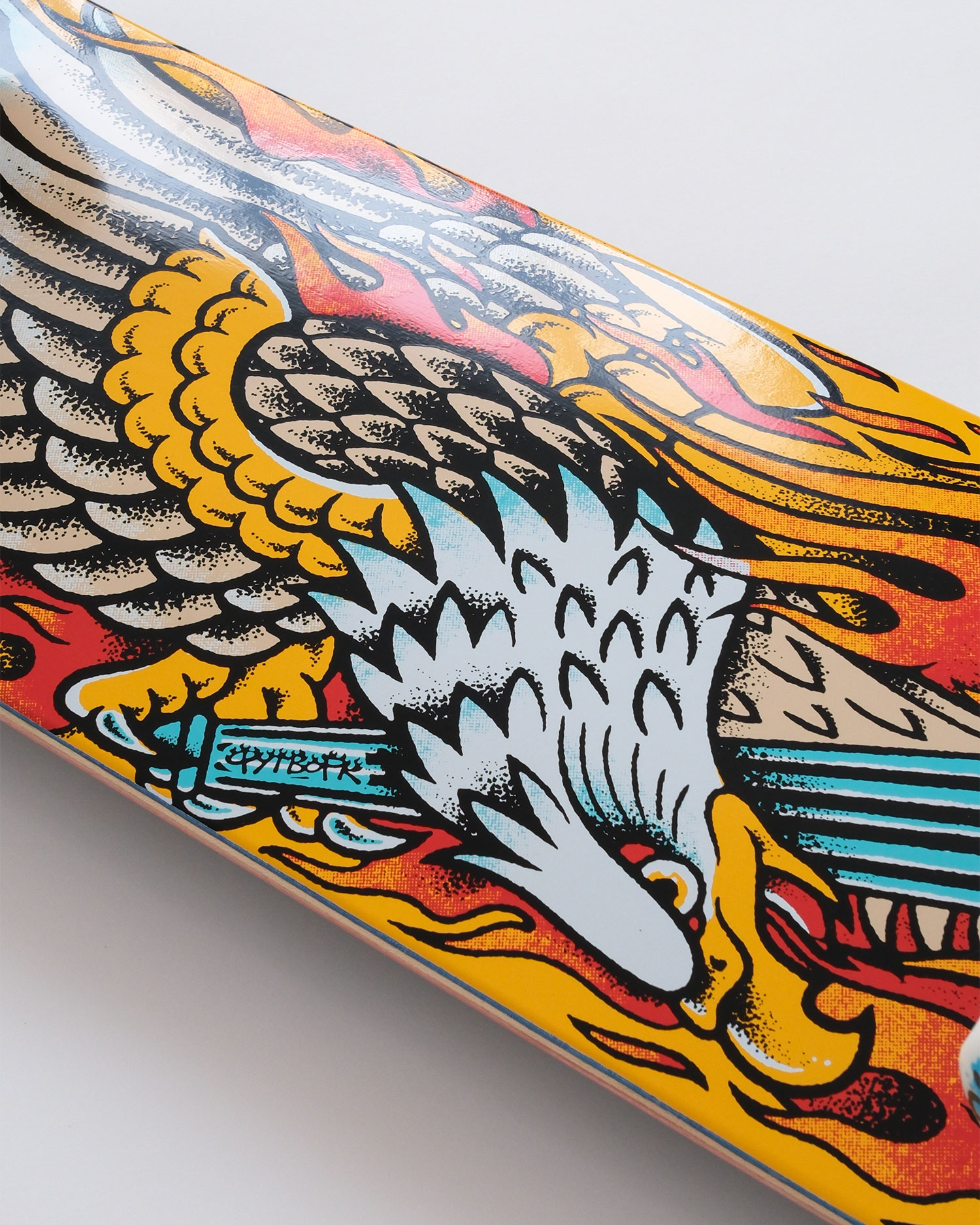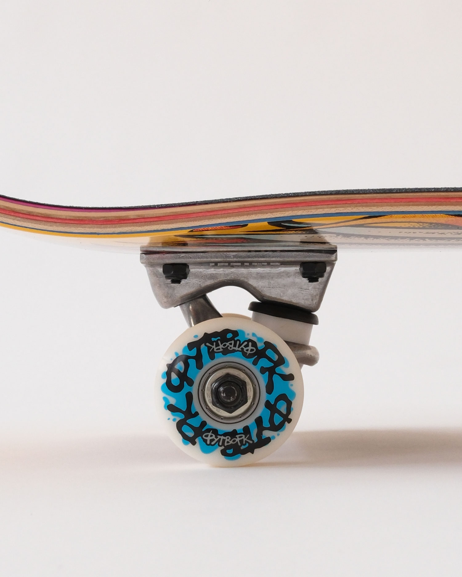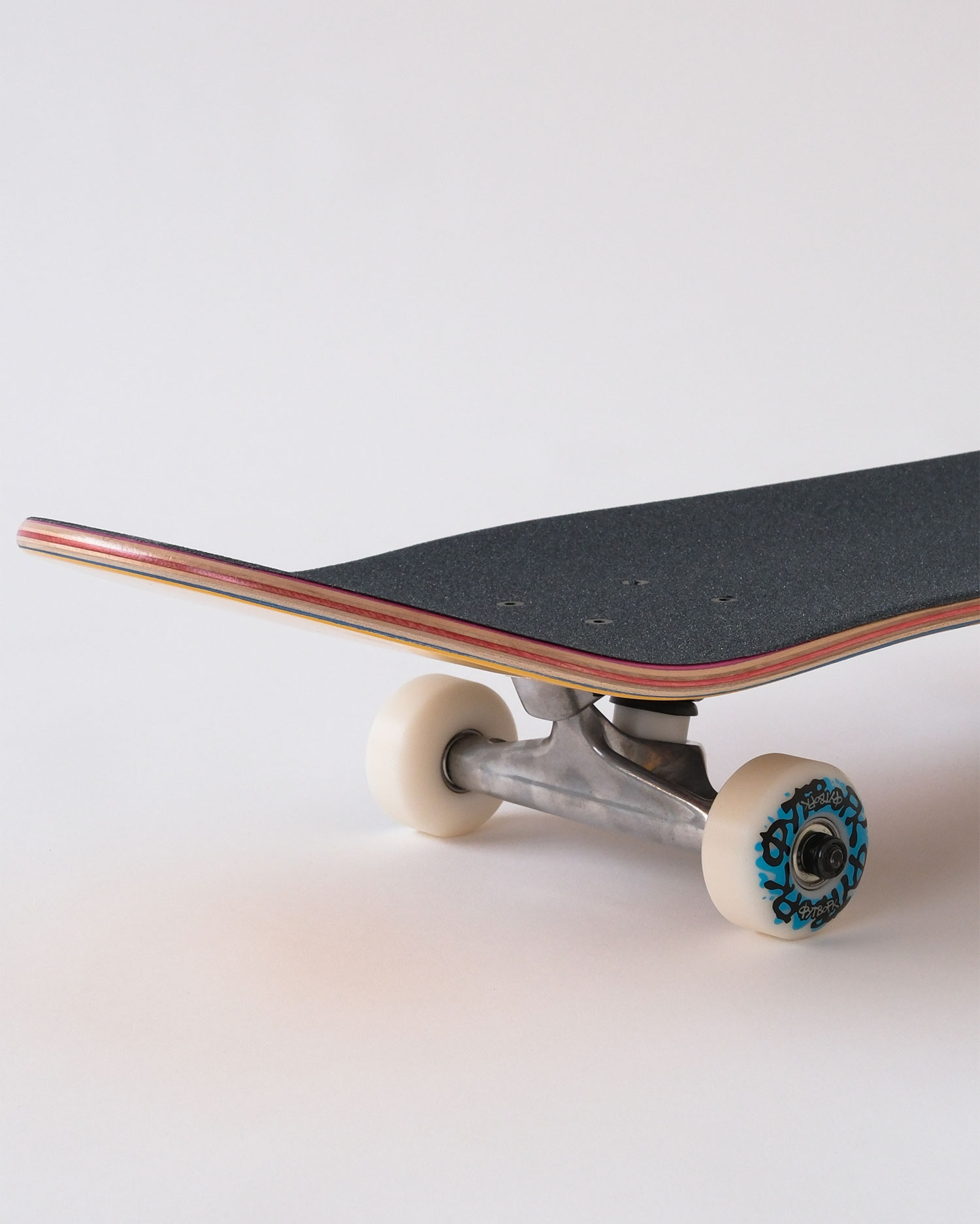 • Специальный клей. В наших готовых скейтбордах используется особый клей на водной основе. С ним дека более гибкая, и ощущения от щелчка будут отличатся чем от например нашей жесткой деки Progress. Зачем это сделанно? Готовый скейтборд, это прежде всего выбор новичка, и пока ты учишься, ты постоянно приземляешь трюки и олли не по болтам. Приземлив одну ногу не туда, можно легко сломать деку. Благодаря тому что дека более гибкая, она простит такие ошибки, и не сломается, просто прогнется и вернется назад. Это важное свойство деки для новичка.